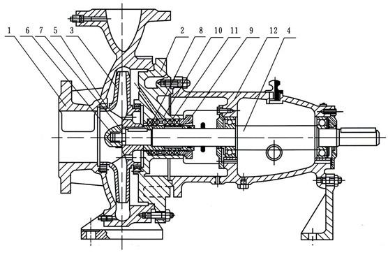 IS、IR型泵系根據(jù)國家標(biāo)準(zhǔn)ISO2858所規(guī)定的性能和尺寸設(shè)計的,主要由泵體(1)、泵蓋(2)、葉輪(3)、軸(4)、密封環(huán)(5)、軸套及懸架軸承部件(12)等所組成。