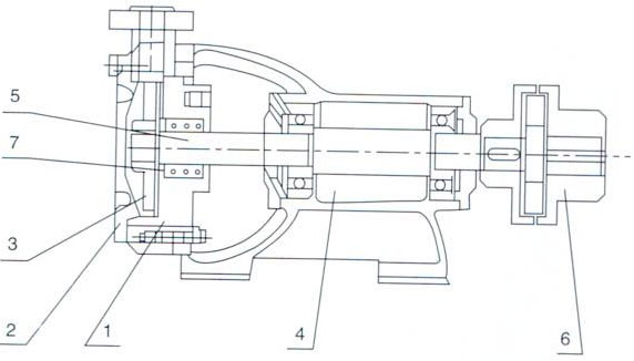 主要零件(見結(jié)構(gòu)圖)有(1)泵(2)泵蓋(3)葉輪(4)托架結(jié)合體(5)泵軸(6)爪型彈性聯(lián)軸器(7)特別組合體機械密封。該型泵與電機合裝在同一底座上.進、出口方向為斜鑰上.經(jīng)接彎管可変為垂直向上。葉輪在軸上能夠自由地作軸向移動,泵在工作中葉輪能自行調(diào)節(jié)好與泵體和泵蓋之間的間隙。