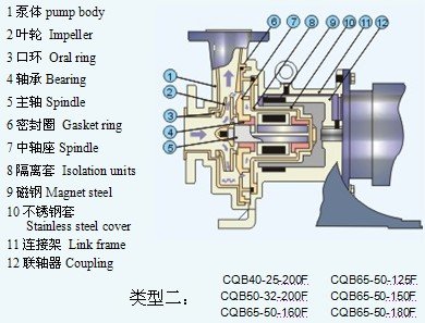 CQ型磁力驅(qū)動(dòng)泵.簡稱磁力泵,是一種通過磁力傳動(dòng)器(磁力聯(lián)軸器)來實(shí)現(xiàn)無接觸力矩傳遞從而以靜密封取代動(dòng)密封.使泵達(dá)到完全無泄漏的離心泵。
