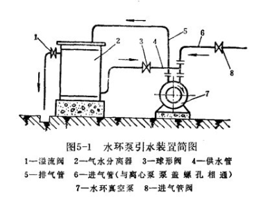 水環(huán)式真空泵引水裝置如圖5-1所示。水環(huán)式真空泵的進(jìn)氣管6與水泵泵蓋的頂部相連,在沒有自來水的地方,必須配置氣水分離器,作為真空泵冷卻水和補(bǔ)充水的水源。